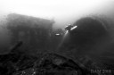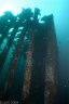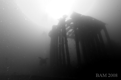 From the unknown wreck we headed over to the OCEAN VENTURE where JT coerced Tom into doing a night dive. I crashed for the night and didn’t get the report until morning. JT didn’t get the lobsters he was after but he said the conditions were nice and that we were tied in near the “cathedral”. I decided to tote the tripod along on this “shallow” (160 fsw) dive, as there were a couple shots I had in mind. The conditions were the same temperature wise as the previous location but the visibility was not quite as good. Actually it was still really good at 40-50 feet, it just seemed paltry after being spoiled the day before. I had a good time snapping away for half an hour waiting for models to pass by. Chip, Andrew, and Mark all played along and I was able to get some pretty sweet shots. Thanks guys!