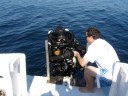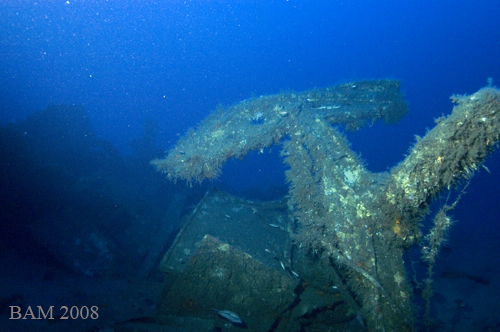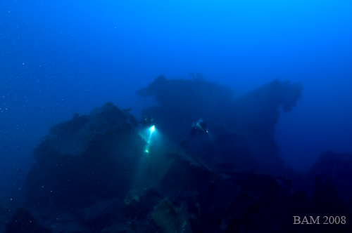 We pulled up and hooked into the stern of the wreck as the sun was rising Saturday morning. It was hard to judge the surface visibility through the reflection off the “glass” but it looked promising š The group was split with 4 CCR divers (I was the only one without some form of Hammerhead) and 2 OC divers, so it was decided that we’d go in 2 groups. After a bubble check at 20 feet we started the long way down the line, passing through a thermocline at around 110 feet where the water dropped from 73F to 60F and the visibility opened up to… a lot!. Around 150 feet the wreck came into view and it was absolutely incredible. It was apparent the grapnel had dropped down by the large superstructure and looking forward you could see cargo holds stretching as far as the eye could see and aft the stern was completely blown apart leaving a large debris field. We hit the highest point on the wreck at about 235 fsw and greeted by a large Mola Mola circling the wreckage in the distance. After checking the hook we set about exploring and looking for something to possibly identify this nameless hulk. The huge boilers lay exposed, framed by the superstructure and towering above the seabed and debris field spread out below making a truly impressive sight in the unbelievable vis. Last year the temperature was in the 40s, this year the temperature never fell below 60 making for an immensely enjoyable dive. Time flies by way too quickly at this depth and with the conditions as they were it was tough to tear away from the bottom.