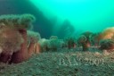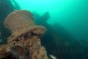 Dave got us tied in to the tip top of the STOLT at 55 fsw in short order and divers started hitting the water. Reports of wildly varying visibility started coming back as I was getting dressed and after sifting through the available data and determining the overall consensus was GOOD, I finally ended up splashing with the intention of taking pics. I knew it was a good choice when I could see the wreck laid out below me from 20 feet. I hit the top of the wreck quickly and after getting a little more organized I dropped down along the break to the sand at 125 fsw to get out of the strong surge on top of the wreck. On the bottom it was a clear 30 feet (maybe a little more) of visibility and about 42 F. After working my way along the bottom I realized my computer decided it wanted to be in gauge mode for this dive. Figures, the one dive I don’t bring tables. Oh well, I knew about my schedule for up to about 30 minutes or so on the bottom so I’d just keep it a little shorter than I wanted and work my way up along the hull. Dave had mentioned the anemones were in full “bloom” and boy was he right. Every bit of steel acreage on the wreck was covered with large colorful anemones and it was the prettiest I ever remember seeing the STOLT. After a trip to the prop which I had never visited before, I came back around the stern and lazily worked back toward the anchor line taking in the sights. As I was trying to get my stuff stowed away for departure I dropped my new tripod down into the wreck (doh) and had to take an excursion back down 30 feet or so to get it. Coming back up I looked up the line from the top of the wreck and sure enough I could make out the silhouette of the Independence waiting for me 55 feet above. Conditions like these make you quickly forget about a little rain and some clouds.