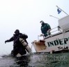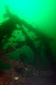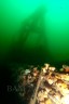 I jumped with the ball to tie in and was glad I had the line in my hand as the surface vis was about zero. However, before “this is gonna suck” fully formed in my mind I was already out of the muck and into the nice clear emerald green water that was below 20 feet. Vis on the bottom at 118 fsw was probably close to 30 feet and temp is up to about 47 F. The wreck is COVERED in growth. Anemones, mussels, and that “furry” stuff obscured most every surface, including the many ropes, lines, hawsers, and other “draperies” hanging about the superstructure and outriggers. I had to dig through thick clumps of hairy sea growth and mussels to get to the beam I wanted to chain into at 80 feet. This sent the swarm of bergalls around the A-frame into a frenzy and attacted the attention of several very large blackfish. I dropped down to the sand to look for scallops and after a couples minutes scanning and not spotting any I called it quits and headed up to grab the camera. There were lots of ling and what I think were pollock (?) on the bottom. Sean later told us he went several hundred feet out in the sand in the quest for scallops and only grabbed a couple so I didn’t feel too bad about my half hearted effort. A couple of bugs were boated and we split just as the seas were starting to pick up. The rain even let up just as we pulled into the slip, so all in all a great day!