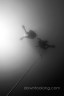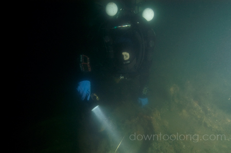 It’s hard to explain the feeling you get when you are 60 miles offshore in the open Atlantic, 230 feet underwater in the total dark on top of an iron coffin containing the remains of 55 German sailors, and your sense of touch is your most valuable asset. However I wasn’t alone as my hand was wedged under a massive compressed air cylinder feeling for the end of the chain that Bill Trent was passing me as we tied into the U-869. Presently we were in a few feet of visibility, barely enough to discern with a little prodding around that we were on top of the bow section near the blast area, but 25 minutes ago we had merrily splashed into cobalt blue 79 degree surface water with 60+ feet of visibility… that warm fuzzy feeling did not last long. Dropping down the line we had passed through several layers of plankton blooms, the ambient light and temperature dimming a bit with each layer. At 100 feet the chilling 46 degree bottom water felt like a slap in the face, and at 160 feet it was lights out. The shot was in a bunch of mono so I had fun cutting that out as Bill hauled the chain to the top of the wreck and began looking for a place to tie in. I went to shoot the shop to the surface but as my lift bag started to rise I found out I missed a strand, and that nearly invisible fishing line was now holding the weight and grapple precariously above my head and threatening to entangle me and take me with it. With one last slash of the z-knife it was on its way up. I saw a dim spot of light and found Bill. His 35 W HID was a couple feet from me. Yes, this IS what I call fun π