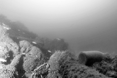 Today the seas were calm but it started out a little overcast with a slight drizzle on the way out to the wreck on the Independence II. I splashed with the shot line and was surprised to find bluish water with a nice 40 feet or so of vis near the surface. Below about 60 feet the temperature dropped and with it the visibility. It wasn’t too bad on the bottom with a decent 15 feet of visibility if you stayed high off the wreck which seemed to dust up very easily and with little to no current it took a while to clear. I came across some of the holds full of the remains of the trucks destined for war that were prematurely relieved of duty. I also found a hold full of the clear 1 quart beer bottles and after sifting through lots of broken ones bagged an intact specimen as a souvenir.