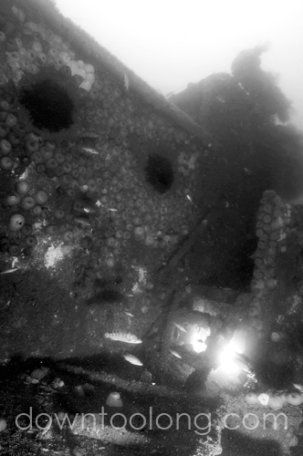 Today we hit the stern section of the torpedoed WWII tanker GULF TRADE (90 fsw). Capt Jim of the Gypsy Blood was nice enough to let us tie up to his stern, and we even committed high seas piracy and got some refreshments including Helen B’s famous pierogies for our spoils. Again, pea soup on the surface, but the vis opened up nicely on the bottom to 20-25 feet. A few lobsters came up and the wreck was loaded with fish, both sea bass and tog.