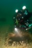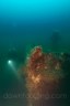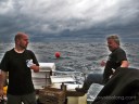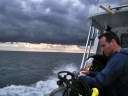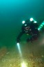 It was quite overcast (to say the least) heading out and a little choppy but manageable. On site we motored around and before long marked a sizable piece of wreckage in 120 fsw and threw the shot line. Bill Trent tied in and in short order divers began splashing in what appeared to be very clear surface water. It turned out the clear blue water went all the way down to the top of the wreck at 100 feet. On the bottom the vis was still reasonable with about 10-15 feet and warm water (mid sixties).