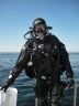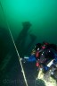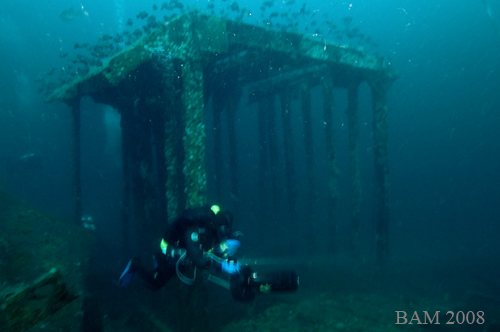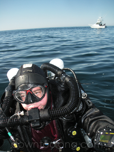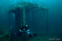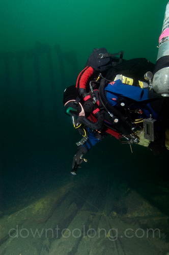 The crew of the Independence headed south this past weekend for a break from “work” and had a great time offshore Virginia Beach aboard the Under Pressure. We left the dock Friday night around midnight for the 50+ mile journey to the wreck of the OCEAN VENTURE (160 fsw). After a pretty smooth ride we awoke to find ourselves hooked into the wreck. The OCEAN VENTURE is a 425′ freighter that was torpedoed by the U-108 in Operation Drumbeat during WWII. Danny and I were the first to splash and after breaking through the particulate laden surface waters were pleased to find good visibility (~40 feet) that continued all the way to the bottom. The anchor line passed directly beside the “cathedral” and I was surprised to see that this large steel framework had greatly collapsed since my last trip here, with the remaining “pillars” waving precariously in the current pretty much ready to fall any time now.