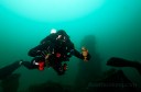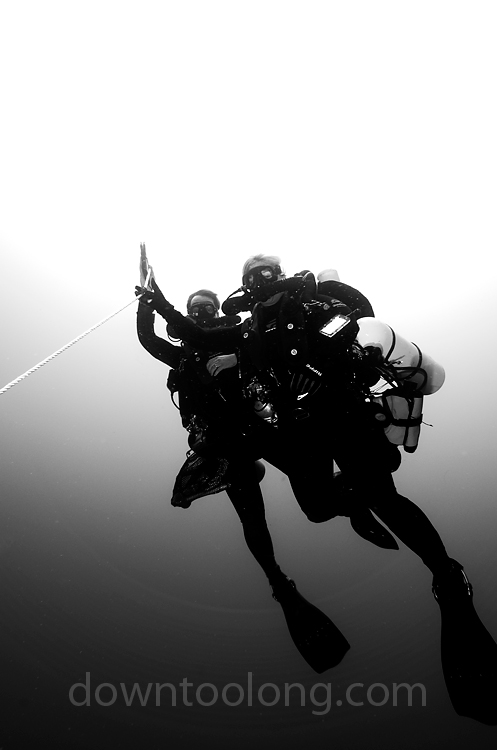 Next up we headed to a wreck Mike is working to identify in 340 fsw. I splashed with Heather and Brian and could hear giddy helium pitched screeches from below telling the good news that we had found a wreck before it even came into sight!