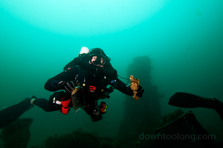 Next up we headed to the steamer LEROY (120 fsw). I was a little delayed in splashing and arrived to find everyone else already being productive. I got to the bottom to find Mike M. racing towards me with an ear to ear grin with a nice bottle in one hand and a slipper lobster in the other, and TJ already had a big red snapper on the stringer which would become an awesome dinner.