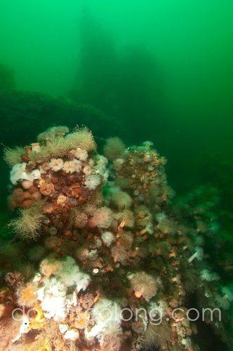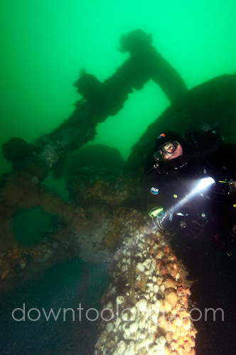 I splashed with Capt Dan and we didn’t even need the anchor line for the descent as you could see the wreck laid out below from 20 feet. The wreck was a fairly good sized steel wreck, but with no evidence of machinery or means of propulsion, and a large towing bitt on the bow we determined this was likely a large steel barge. Fish of all types covered the wreck, including sea bass, cod, and several monster tog indicating that divers or fisherman must not hit this often. After touring the wreck we tied off a reel and headed out into the sand to fill a bag of scallops which were plentiful. I took a look up as I began my ascent and was pleasantly surprised to find that I could see the Independence almost 100 feet above. Sweet!