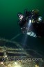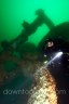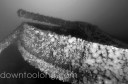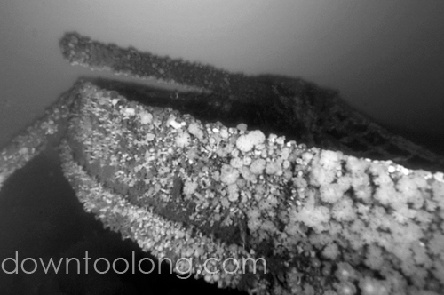 It was quite overcast (to say the least) heading out and a little choppy but manageable. On site we motored around and before long marked a sizable piece of wreckage in 120 fsw and threw the shot line. Bill Trent tied in and in short order divers began splashing in what appeared to be very clear surface water. It turned out the clear blue water went all the way down to the top of the wreck at 100 feet. On the bottom the vis was still reasonable with about 10-15 feet and warm water (mid sixties).