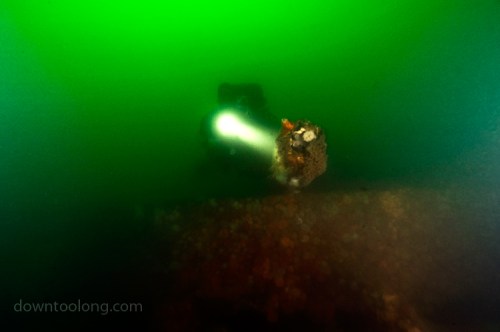 Dan Martinez hovers over the stern deck gun of the freighter AYURUOCA (Oil Wreck) in the Mud Hole off New Jersey