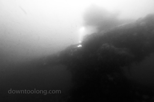 Dan Martinez hovers over the breach of the stern deck gun of the freighter AYURUOCA (Oil Wreck) in the Mud Hole off New Jersey