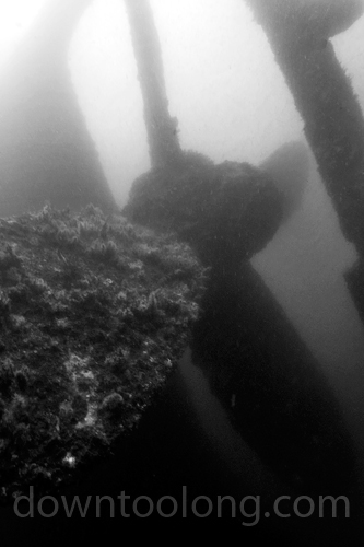 Prop of the LANCING (160 fsw) off Cape Hatteras, NC. Wreck is turtled.