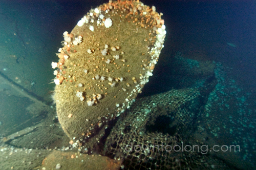 Single blade of the propeller of the NORNESS rises from the mud and nets at 290 fsw