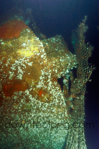 The very stern of the NORNESS shrouded in derelict fishing nets