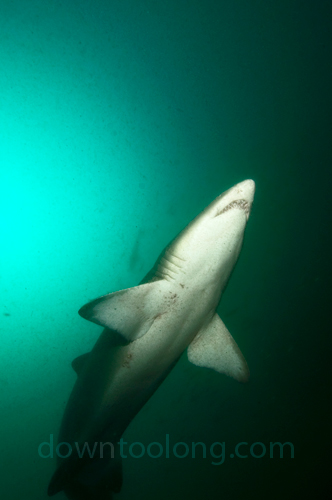 Sand tiger shark on the wreck of the PROTEUS (130 fsw) off Cape Hatteras, NC. Visibility was less than 10 feet this day, allowing the sharks to get very close.