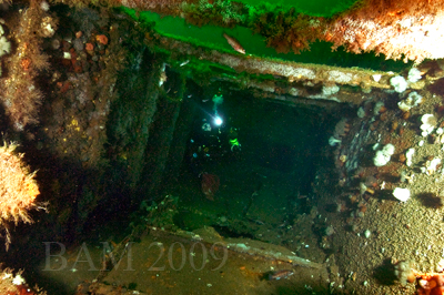 Rob Infante swims down a hallway inside the STOLT DAGALI