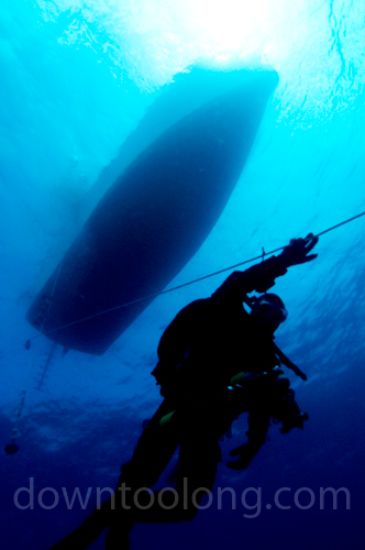 Steve Russell decompresses after a dive to the TAMAULIPAS (160 fsw)